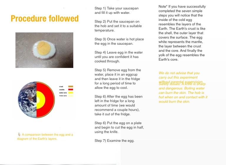 Note* If you have successfully completed the seven simple steps you will notice that the inside of the cold egg resembles the layers of the Earth. The Earth's crust is like the shell, the outer layer that covers the surface. The egg white represents the mantle, the layer between the crust and the core. And finally the yolk of the egg resembles the Earth's core.
