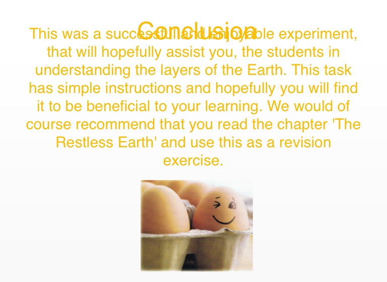 This was a successful and enjoyable experiment, that will hopefully assist you, the students in understanding the layers of the Earth. This task has simple instructions and hopefully you will find it to be beneficial to your learning. We would of course recommend that you read the chapter 'The Restless Earth' and use this as a revision exercise.