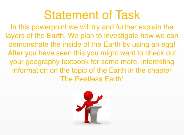 In this powerpoint we will try and further explain the layers of the Earth. We plan to investigate how we can demonstrate the inside of the Earth by using an egg! After you have seen this you might want to check out your geography textbook for some more, interesting information on the topic of the Earth in the chapter 'The Restless Earth'.
