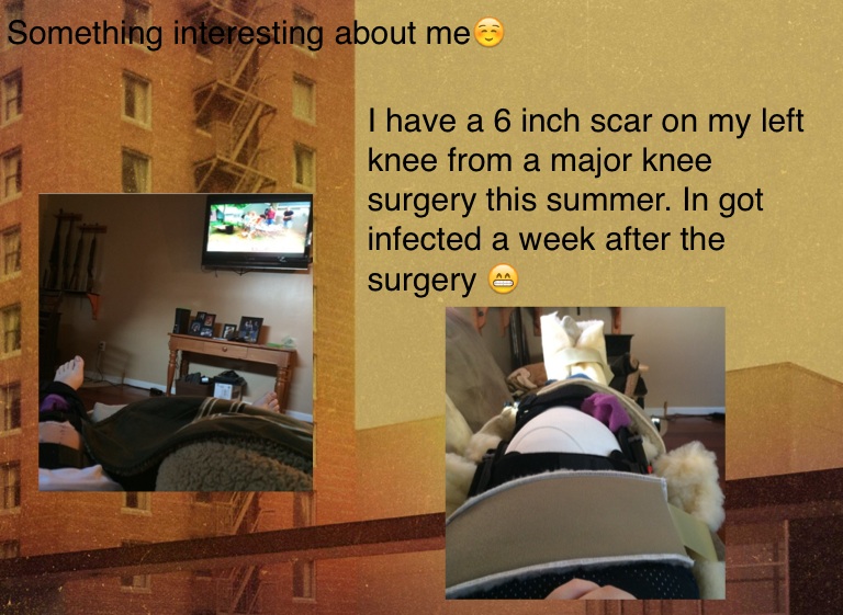 I have a 6 inch scar on my left knee from a major knee surgery this summer. In got infected a week after the surgery 😁