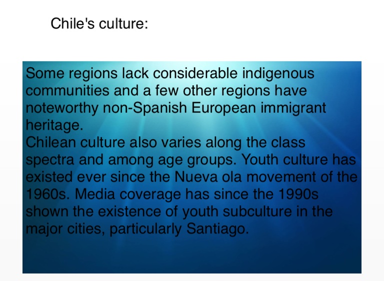 Chilean culture also varies along the class spectra and among age groups. Youth culture has existed ever since the Nueva ola movement of the 1960s. Media coverage has since the 1990s shown the existence of youth subculture in the major cities, particularly Santiago.