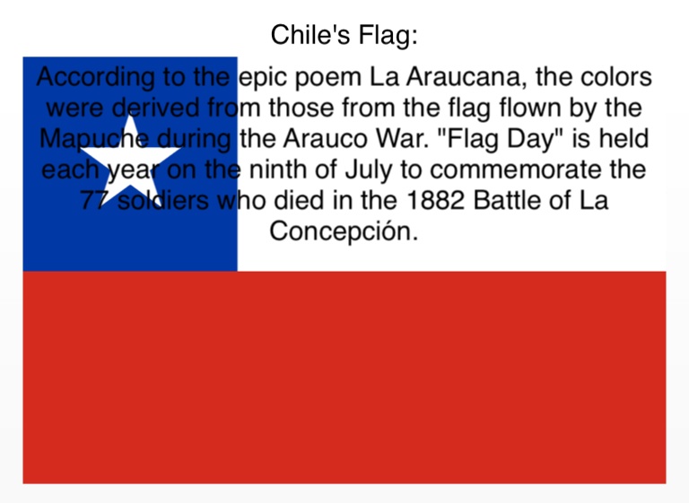 According to the epic poem La Araucana, the colors were derived from those from the flag flown by the Mapuche during the Arauco War. "Flag Day" is held each year on the ninth of July to commemorate the 77 soldiers who died in the 1882 Battle of La Concepción.