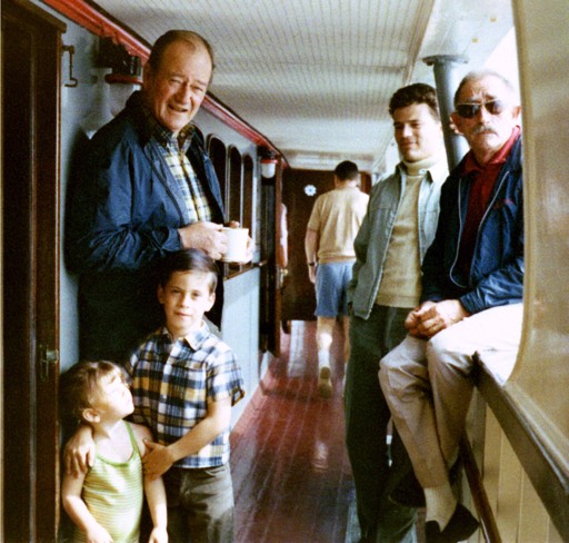 Left: Marisa, Ethan, John Wayne, Patrick Wayne, and Captain Pete Stein on the deck of the Wild Goose.