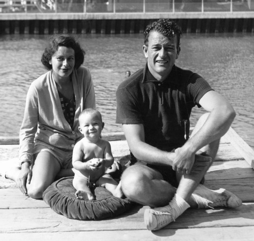 John Wayne with wife Josephine and their first son Michael on a Southern California dock.