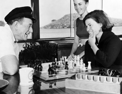 Daughter Melinda enjoys a game of chess with her father while Wayne's daughter-in-law Peggy watches.