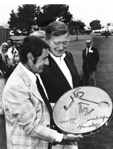 John Wayne with co founder Ken Willig at the grand opening of the John Wayne Tennis Club in 1974.
