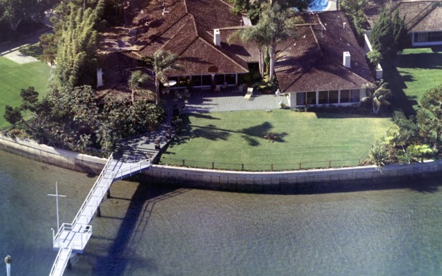 Aerial view of Wayne's waterfront ranch style home in Bayshores, Newport Beach.
