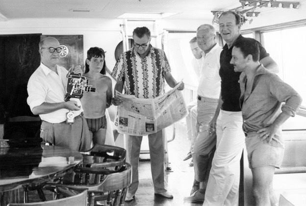 Having filmed over 175 movies in six decades, John Wayne often mixed business with pleasure. Above, John Wayne is interviewed aboard the Wild Goose.