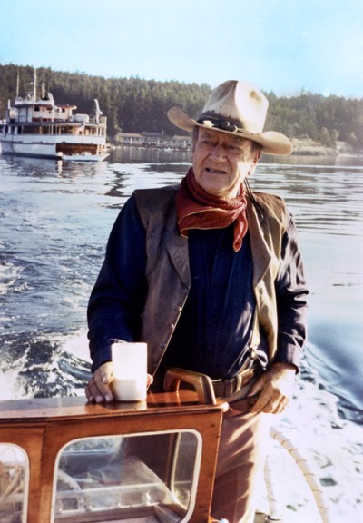 Always prepared, John Wayne brought along his western wardrobe on the Wild Goose. Right, he is heading to shore to film a Great Western Savings commercial.