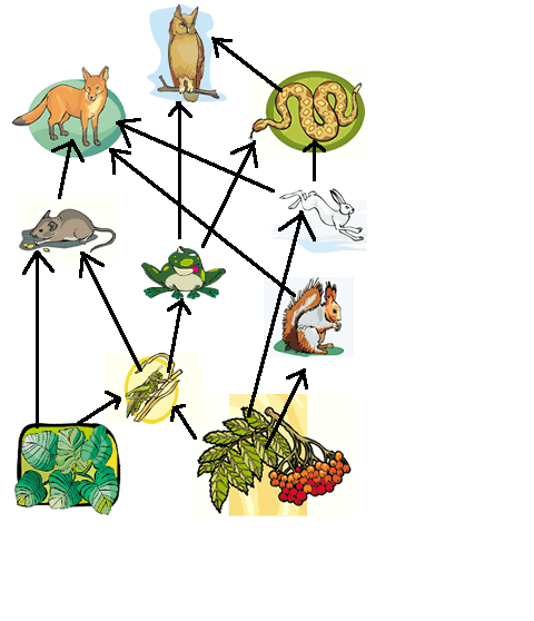 An assortment of animals mixed together and arrows showing what they would eat or would be eaten by.