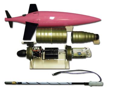 The sea glider looks like a missile that has a big pair of horizontal wings and a smaller pair of vertical wings behind that. It has a long antenna sticking out the back of it. It has a fiberglass shell and inside it are anodized aluminum panels which are separated by ring frames. It has internal and external sensors.