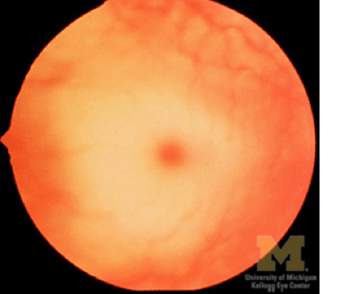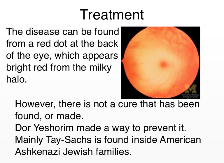 The disease can be found from a red dot at the back of the eye, which appears bright red from the milky halo.