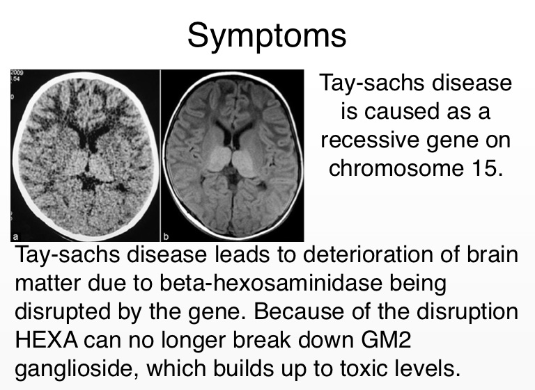 Tay-sachs disease leads to deterioration of brain matter due to beta-hexosaminidase being disrupted by the gene. Because of the disruption HEXA can no longer break down GM2 ganglioside, which builds up to toxic levels.
