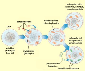 The endosymbiotic theory suggests that a large prokaryote engulfed a smaller prokaryote and the two organisms lived symbiotically. Eventually the two organisms became a single, more highly developed organism. Some scientists believe that the mitochondria and chloroplasts found in eukaryotes were once their own organisms. The endosymbiotic theory is said to have created the first Protists billions of years ago.