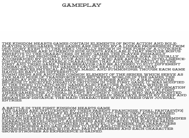 The games are influenced by their parent franchise, Final Fantasy,[73] and carry its gameplay elements over into their own action-based, hack-and-slash system. Like many traditional role-playing games, Kingdom Hearts features an experience point system which determines character development. As enemies are defeated, the player gains experience which culminates in a "level-up", where the characters grow stronger and gain access to new abilities.[74] The amount of experience is shared with all party members and each character grows stronger as experience is gained.
