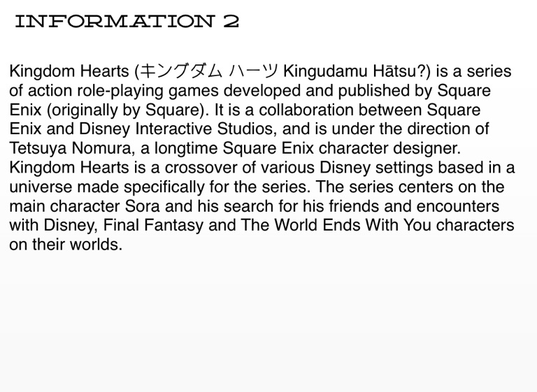 Kingdom Hearts (キングダム ハーツ Kingudamu Hātsu?) is a series of action role-playing games developed and published by Square Enix (originally by Square). It is a collaboration between Square Enix and Disney Interactive Studios, and is under the direction of Tetsuya Nomura, a longtime Square Enix character designer. Kingdom Hearts is a crossover of various Disney settings based in a universe made specifically for the series. The series centers on the main character Sora and his search for his friends and encounters with Disney, Final Fantasy and The World Ends With You characters on their worlds.