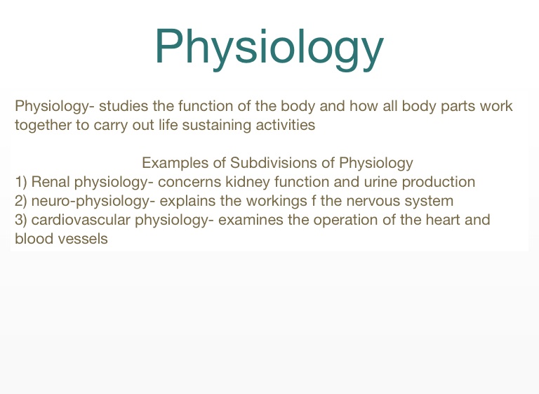 Physiology- studies the function of the body and how all body parts work together to carry out life sustaining activities