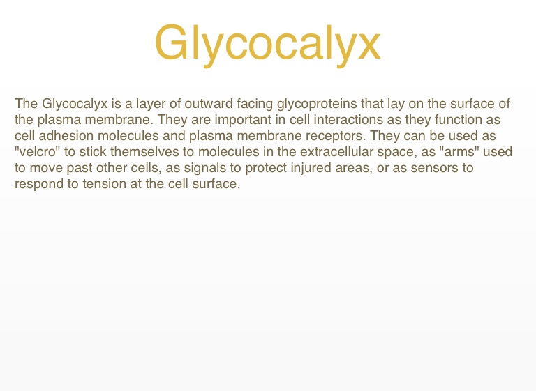 The Glycocalyx is a layer of outward facing glycoproteins that lay on the surface of the plasma membrane. They are important in cell interactions as they function as cell adhesion molecules and plasma membrane receptors. They can be used as "velcro" to stick themselves to molecules in the extracellular space, as "arms" used to move past other cells, as signals to protect injured areas, or as sensors to respond to tension at the cell surface.