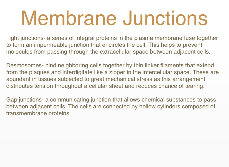Tight junctions- a series of integral proteins in the plasma membrane fuse together to form an impermeable junction that encircles the cell. This helps to prevent molecules from passing through the extracellular space between adjacent cells.