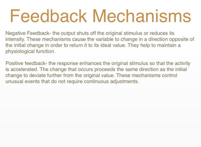 Negative Feedback- the output shuts off the original stimulus or reduces its intensity. These mechanisms cause the variable to change in a direction opposite of the initial change in order to return it to its ideal value. They help to maintain a physiological function.