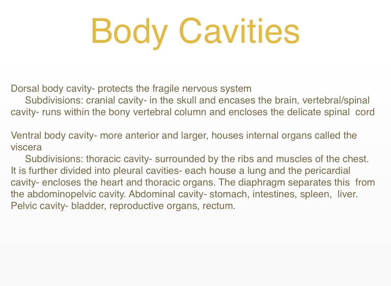 Subdivisions: thoracic cavity- surrounded by the ribs and muscles of the chest. It is further divided into pleural cavities- each house a lung and the pericardial cavity- encloses the heart and thoracic organs. The diaphragm separates this from the abdominopelvic cavity. Abdominal cavity- stomach, intestines, spleen, liver. Pelvic cavity- bladder, reproductive organs, rectum.