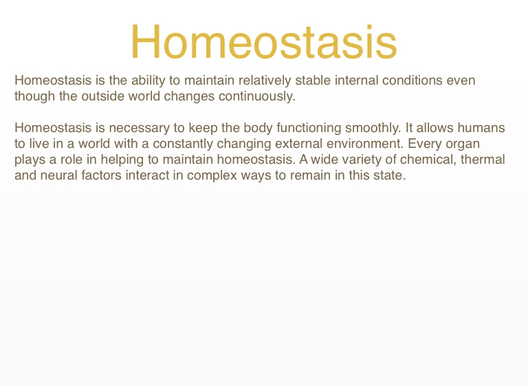 Homeostasis is necessary to keep the body functioning smoothly. It allows humans to live in a world with a constantly changing external environment. Every organ plays a role in helping to maintain homeostasis. A wide variety of chemical, thermal and neural factors interact in complex ways to remain in this state.