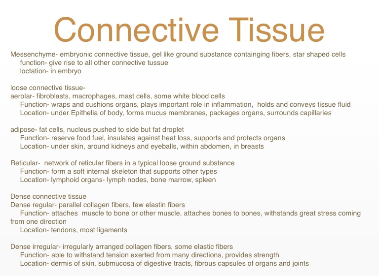 Location- under Epithelia of body, forms mucus membranes, packages organs, surrounds capillaries