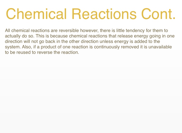 All chemical reactions are reversible however, there is little tendency for them to actually do so. This is because chemical reactions that release energy going in one direction will not go back in the other direction unless energy is added to the system. Also, if a product of one reaction is continuously removed it is unavailable to be reused to reverse the reaction.