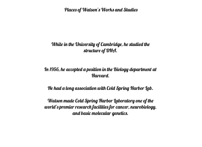 Watson made Cold Spring Harbor Laboratory one of the world's premier research facilities for cancer, neurobiology, and basic molecular genetics.