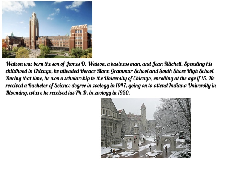 Watson was born the son of James D. Watson, a business man, and Jean Mitchell. Spending his childhood in Chicago, he attended Horace Mann Grammar School and South Shore High School. During that time, he won a scholarship to the University of Chicago, enrolling at the age if 15. He received a Bachelor of Science degree in zoology in 1947, going on to attend Indiana University in Blooming, where he received his Ph.D. in zoology in 1950.