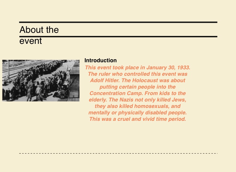 This event took place in January 30, 1933. The ruler who controlled this event was Adolf Hitler. The Holocaust was about putting certain people into the Concentration Camp. From kids to the elderly. The Nazis not only killed Jews, they also killed homosexuals, and mentally or physically disabled people. This was a cruel and vivid time period.