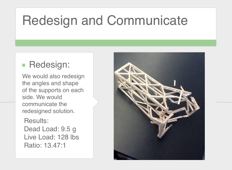 We would also redesign the angles and shape of the supports on each side. We would communicate the redesigned solution.