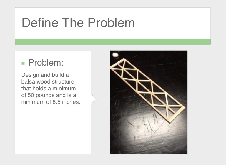 Design and build a balsa wood structure that holds a minimum of 50 pounds and is a minimum of 8.5 inches.