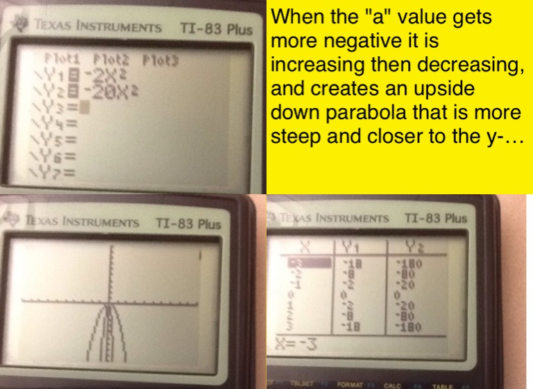 When the "a" value gets more negative it is increasing then decreasing, and creates an upside down parabola that is more steep and closer to the y-axis.
