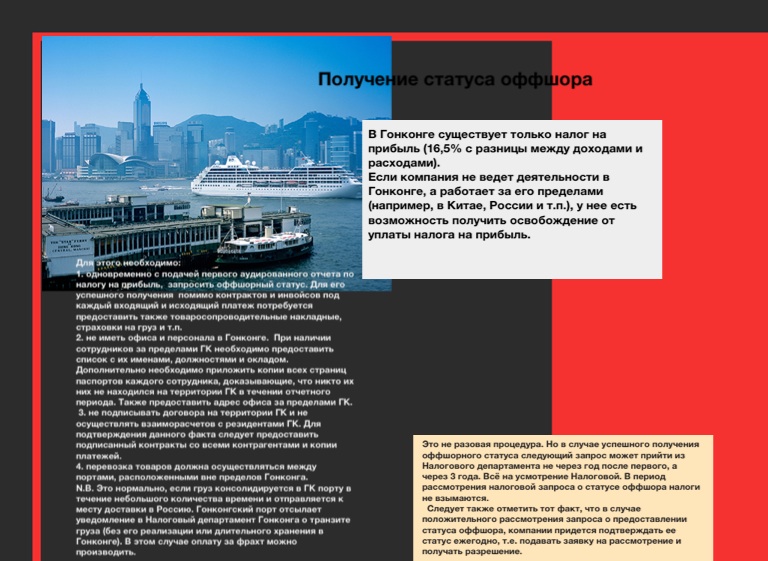 Если компания не ведет деятельности в Гонконге, а работает за его пределами (например, в Китае, России и т.п.), у нее есть возможность получить освобождение от уплаты налога на прибыль.