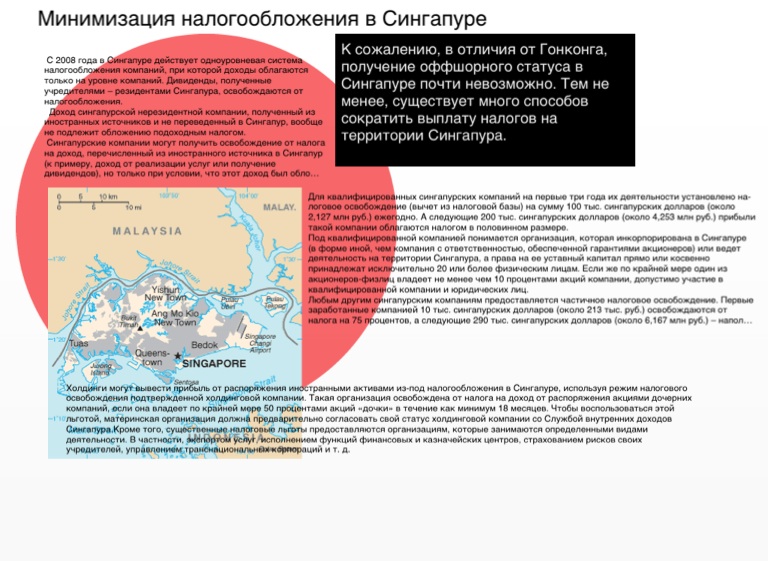 К сожалению, в отличия от Гонконга, получение оффшорного статуса в Сингапуре почти невозможно. Тем не менее, существует много способов сократить выплату налогов на территории Сингапура.