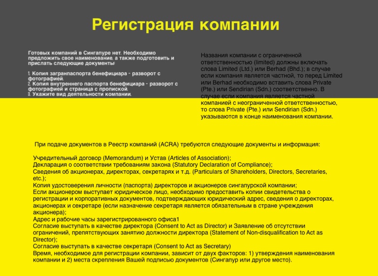 При подаче документов в Реестр компаний (ACRA) требуются следующие документы и информация: