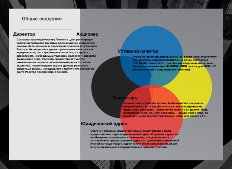 Согласно законодательству Гонконга , для регистрации компании требуется минимум один акционер и директор, данные об акционерах и директорах хранятся в публичном Реестре. Акционером и директором может являться как юридическое, так и физическое лицо. Но, в случае с директором, необходимым условием является 1 директор- физическое лицо. Intercorp предоставляет услуги номинального сервиса ( номинальный директор и/или акционер), позволяющего скрыть данные реального владельца фирмы, находящиеся в публичном доступе на сайте Реестра предприятий Гонконга.