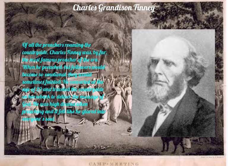 Of all the preachers roaming the countryside, Charles Finney was, by far, the most famous preacher of the era. When he preached, his followers would become so emotional, they would sometimes fainted. He converted at the age of 29 and traveled the countryside on horseback to deliver the message of God. He was high drama when preaching and it felt like he glared into everyone's soul.