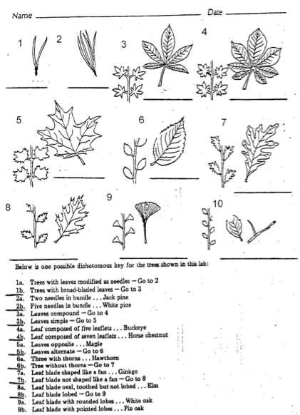This is a dichotomous key. You use it to tell what multiple things are. If a leaf is needle shaped then go to 2. It's on the left side of the paper. Then you have to know if your leaf is a bundle of them together or just one. This goes on until it says, hawthorn or white oak, and you've got your type of leaf.