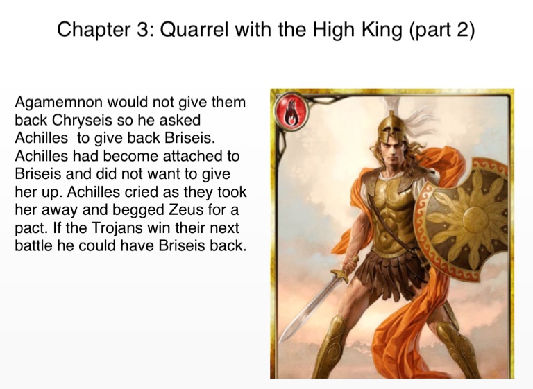 Agamemnon would not give them back Chryseis so he asked Achilles to give back Briseis. Achilles had become attached to Briseis and did not want to give her up. Achilles cried as they took her away and begged Zeus for a pact. If the Trojans win their next battle he could have Briseis back.