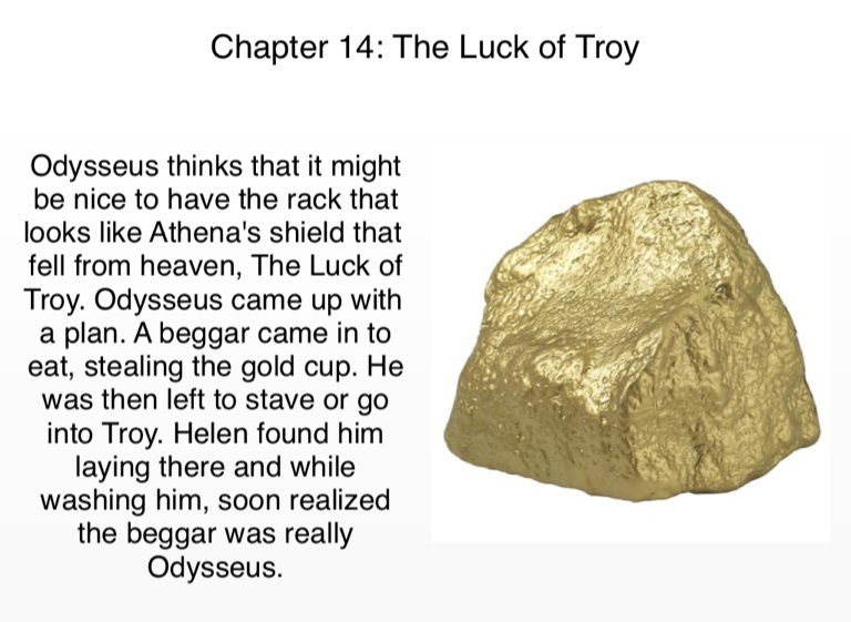 Odysseus thinks that it might be nice to have the rack that looks like Athena's shield that fell from heaven, The Luck of Troy. Odysseus came up with a plan. A beggar came in to eat, stealing the gold cup. He was then left to stave or go into Troy. Helen found him laying there and while washing him, soon realized the beggar was really Odysseus.