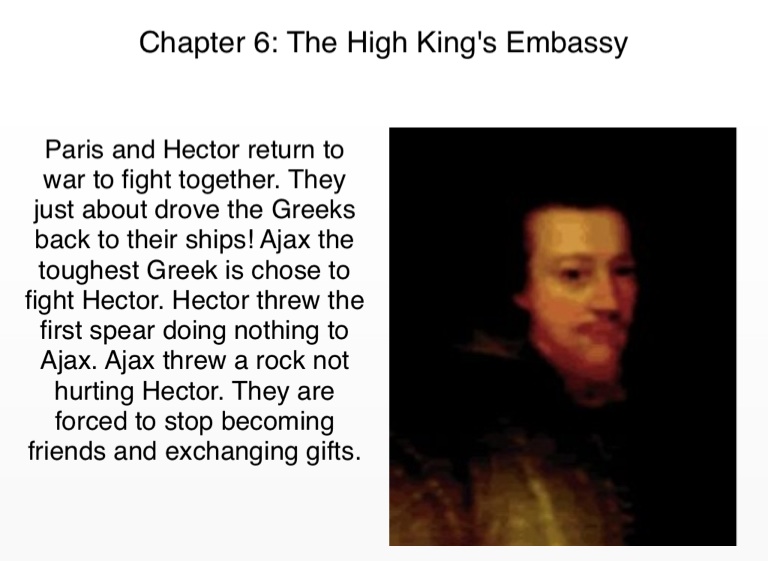 Paris and Hector return to war to fight together. They just about drove the Greeks back to their ships! Ajax the toughest Greek is chose to fight Hector. Hector threw the first spear doing nothing to Ajax. Ajax threw a rock not hurting Hector. They are forced to stop becoming friends and exchanging gifts.