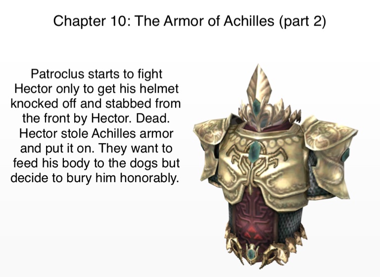 Patroclus starts to fight Hector only to get his helmet knocked off and stabbed from the front by Hector. Dead. Hector stole Achilles armor and put it on. They want to feed his body to the dogs but decide to bury him honorably.