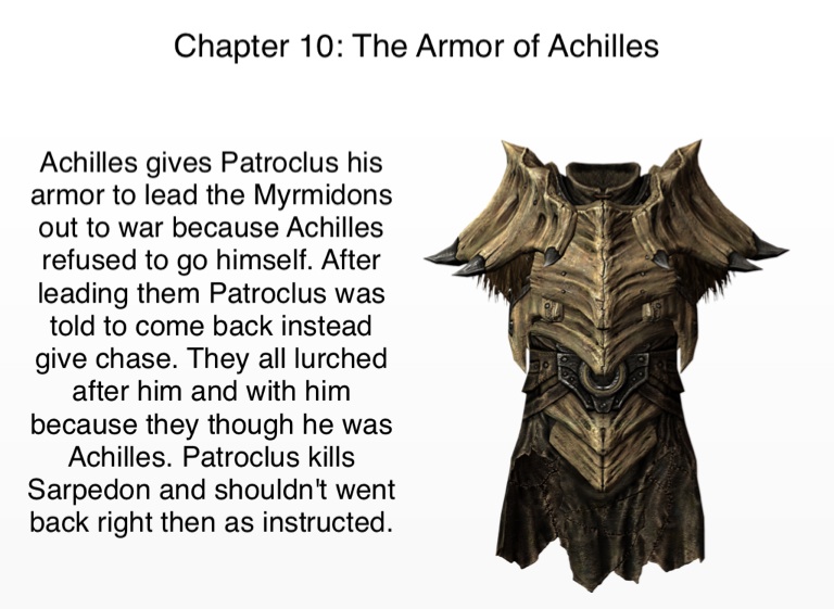 Achilles gives Patroclus his armor to lead the Myrmidons out to war because Achilles refused to go himself. After leading them Patroclus was told to come back instead give chase. They all lurched after him and with him because they though he was Achilles. Patroclus kills Sarpedon and shouldn't went back right then as instructed.