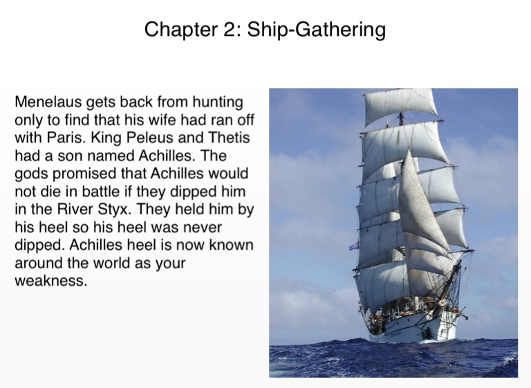 Menelaus gets back from hunting only to find that his wife had ran off with Paris. King Peleus and Thetis had a son named Achilles. The gods promised that Achilles would not die in battle if they dipped him in the River Styx. They held him by his heel so his heel was never dipped. Achilles heel is now known around the world as your weakness.