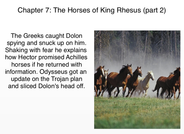 The Greeks caught Dolon spying and snuck up on him. Shaking with fear he explains how Hector promised Achilles horses if he returned with information. Odysseus got an update on the Trojan plan and sliced Dolon's head off.