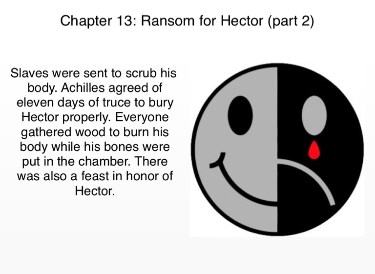 Slaves were sent to scrub his body. Achilles agreed of eleven days of truce to bury Hector properly. Everyone gathered wood to burn his body while his bones were put in the chamber. There was also a feast in honor of Hector.