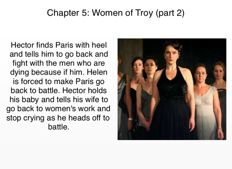Hector finds Paris with heel and tells him to go back and fight with the men who are dying because if him. Helen is forced to make Paris go back to battle. Hector holds his baby and tells his wife to go back to women's work and stop crying as he heads off to battle.