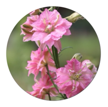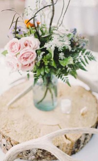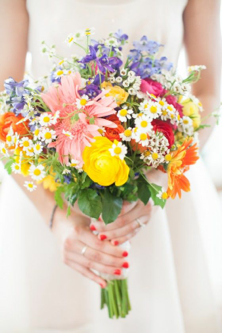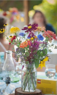 The use of pink, purple and yellow wild flowers in combination with leafy greens and ferns. With elements of